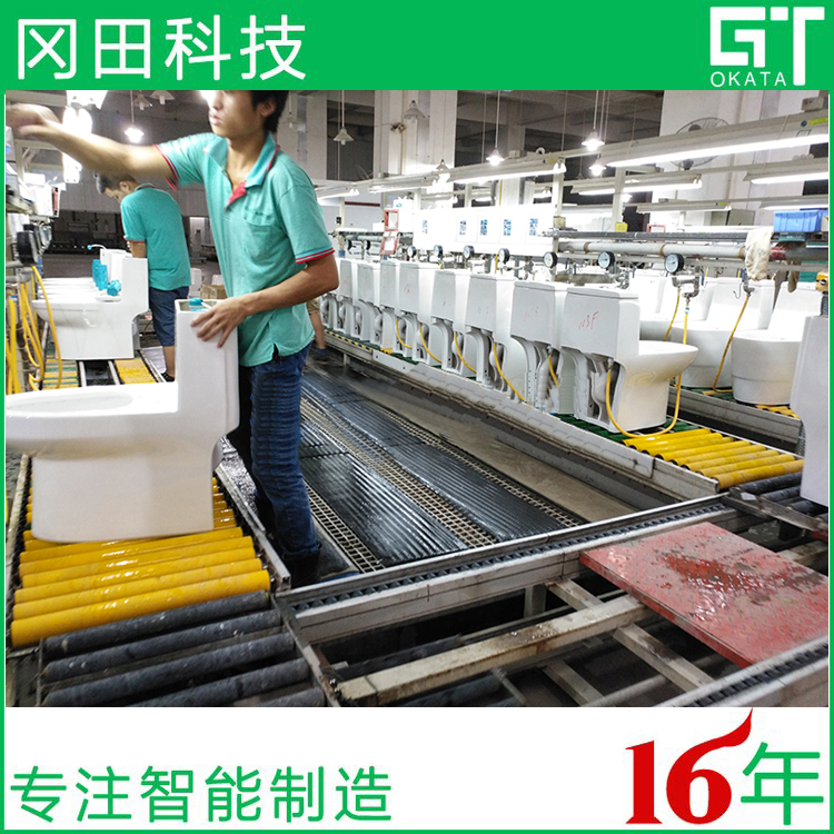 因為連體馬桶比較重,適合選擇做自動組裝線輸送,必須要做單層工裝板或許上下層旋轉(zhuǎn)工裝板。其線體用高強(qiáng)度鋁型材制作,