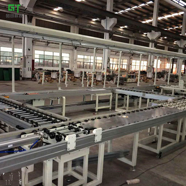 2、無動力滾輪線上的頂升移載機與接駁滾輪線同時動作,將工裝輸送至無動力滾輪線上;